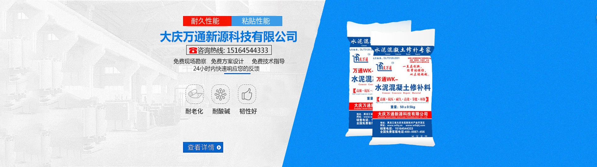 大慶萬通新源科技有限公司獨有的混凝土路面高強速補料,是水泥混凝土路面病害修復的好材料。疲勞、凍融循環(huán)、彎曲壓力、滲水和基層破壞等原因都會引起水泥路面的破損,從而帶來高昂的維護費用。與以往的剛性修補方法不同,混凝土水泥路面維修速補膠提供了一種獨特的柔性修補產(chǎn)品和技術(shù),高柔性、高抗拉性,可跨伸縮縫施工和高抗壓性使得混凝土快補產(chǎn)品為水泥混凝土路面提供了******性的修補。傳統(tǒng)的剛性修補方案,如環(huán)氧砂漿和快干水泥產(chǎn)品,由于其自身的粘結(jié)失效,抗疲勞性低以及與原路面不同的伸縮系數(shù),修補面會在短時間內(nèi)失效或產(chǎn)生新的裂縫,需要反復修補,有效期短且費用高昂。大慶萬通新源科技有限公司的混凝土水泥路面維修速補膠可以隨原路面一起伸縮,移動,從而避免了粘結(jié)失效和產(chǎn)生新裂縫。萬通快補產(chǎn)品優(yōu)異的粘結(jié)性、柔韌性和高防滑性,特別適用于水泥路面的淺層粘合修補,多邊角混凝土板層修補,跨伸縮縫修補以及路面沉陷修補。萬通混凝土病害修補料針對混凝土起皮起沙、斷板裂縫、蜂窩麻面、坑槽露石子、漏筋掉皮、橋梁的掉皮漏筋快速通車使用時間長。應(yīng)用萬通快補產(chǎn)品,施工后一天就可以恢復交通。大慶萬通新源科技有限公司的萬通水泥路面維修速補膠適用于高速公路、機場路面、農(nóng)村村村通路面、廠坪、學校操場、市區(qū)公路、小區(qū)路面、橋梁、水泥路面的修補。使用萬通特快補材料修補路面可以一勞永逸! 水泥地面起砂怎么辦,混凝土修補劑混凝土地面起砂,混凝土地面修補,地面起砂怎么辦,